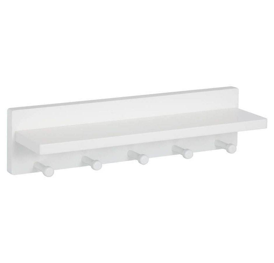 Add convenient storage to any wall with the Storage Shelf - 5 Pegs. Made of wood and easy to install, this little shelf is a great way to add coat storage, key storage and a display shelf for small knick-knacks inside your entry way - or in any convenient location. Umbrellas, hats, leashes and a variety of items are easily hung in one convenient location. Simply-designed and neutral in color, the Storage Shelf - 5 Pegs looks great in any room. Photos, small vases, dog treats, outgoing mail and other items store nicely on the shelf. You're sure to have lots of ideas for this handy shelf, wherever you install it.