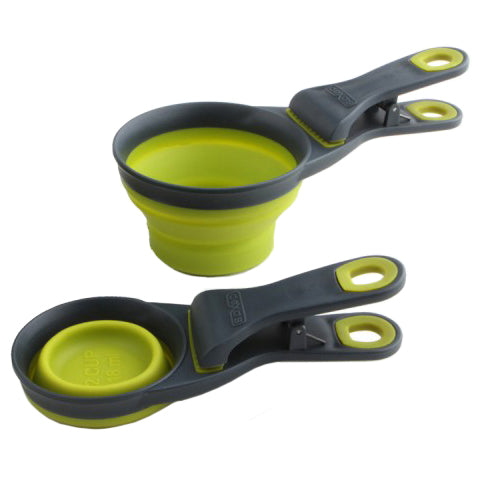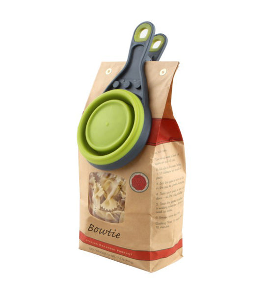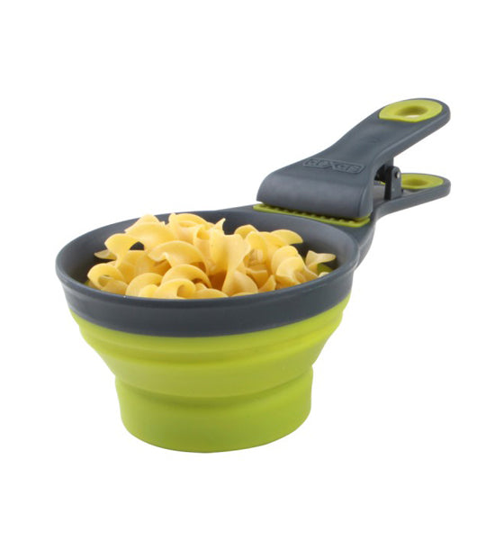 The Food Scoop - Measuring Cup - Bag Clip is a clever, space-saving, combination kitchen gadget that measures, scoops, and also clips food bags. On top of all that, the cup portion collapses for storage or for use as a potato chip clip. The large, strong clip is a spring-type and holds bags tightly closed. Measuring cup is 1/2 cup or 118 milliliter size. As a scoop, it is great for scooping granola and for portion control. Food clip is dishwasher safe and made of sturdy plastic, metal and silicone. Photo shows one scoop in open and collapsed positions.