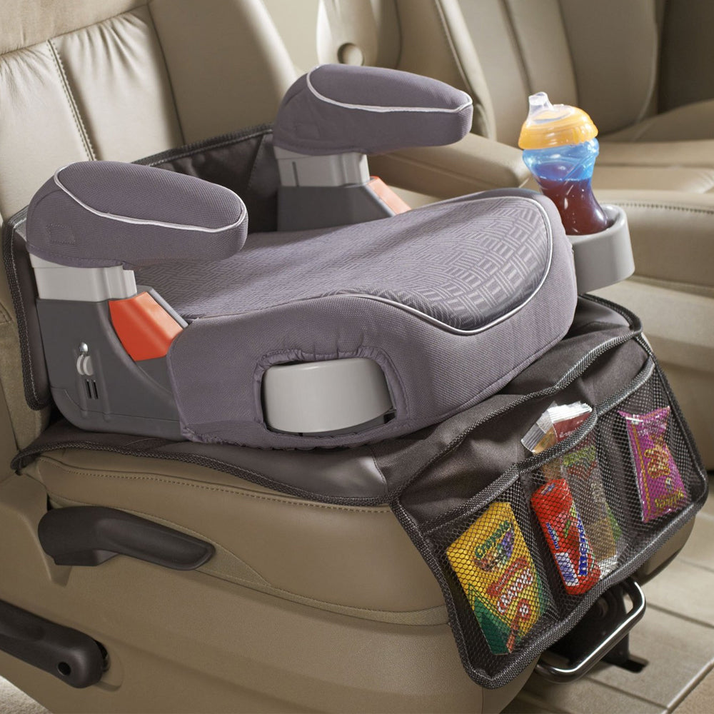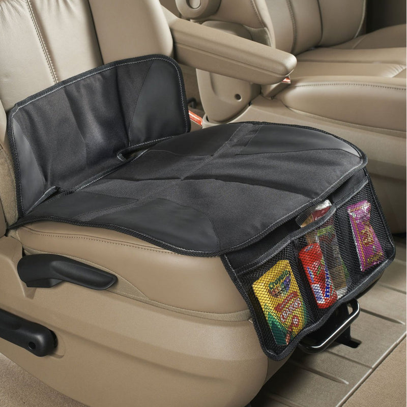 Keep your car's upholstery looking like new with help from this Car Seat Protector Mat. Keep hard infant car seats or booster seats from damaging your leather upholstery or shifting around on tight turns with this car seat pocket organizer. The rubberized grips on the bottom, the faux leather patches, and the corner seat belt slots combine to keep the protector mat firmly in place. The three mesh pockets offer space to store baby wipes, snacks, toys, and other accessories to keep your small child occupied on long car rides.