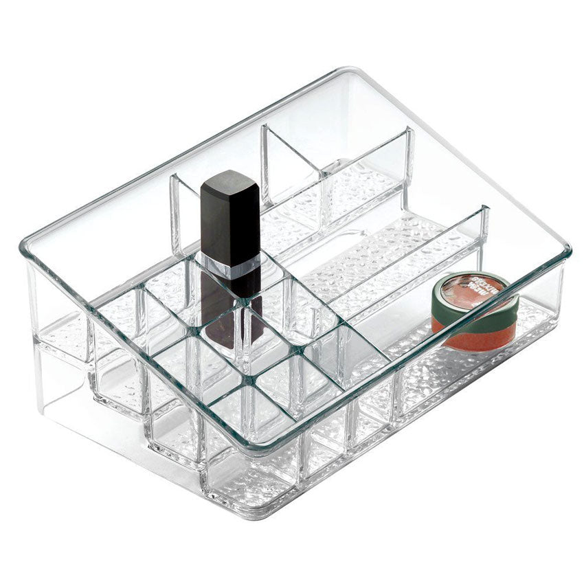 Store and organize your lipstick and other small cosmetics conveniently in the Rain Clear Plastic Vanity Organizer. This handy cosmetic storage tray features a three-tier step design that keeps all items easily accessible, and includes a nine-compartment lipstick organizer.