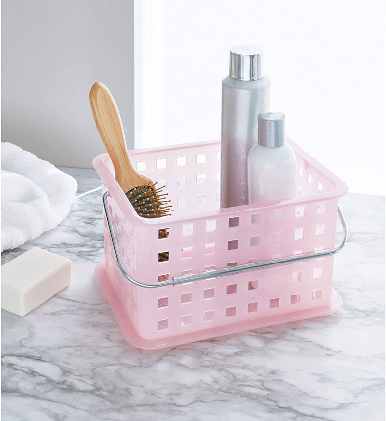 These Stackable Plastic Storage Baskets are great plastic totes for organizing clutter in your bathroom, kitchen, closet, and more. These stackable plastic baskets include a sturdy chrome handle with a soft rubber grip and have drainage holes to allow water to escape, making them great for use as a shower caddy or bath tote.
