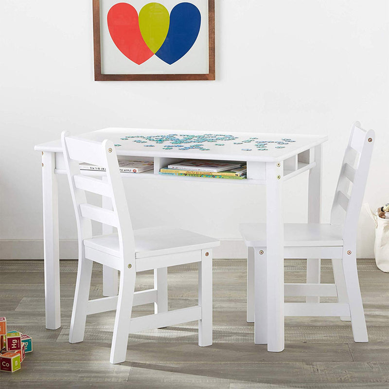Provide your children and their playmates with a great place to socialize, work on art projects like drawings and paintings, read, and more with this beautiful Kids Table and Chair Set. This children's table and chairs set features a built-in under table storage shelf that's great for storing board games, coloring books, art supplies, and more on hand and ready for use and includes two wooden kid's chairs in three popular finishes.