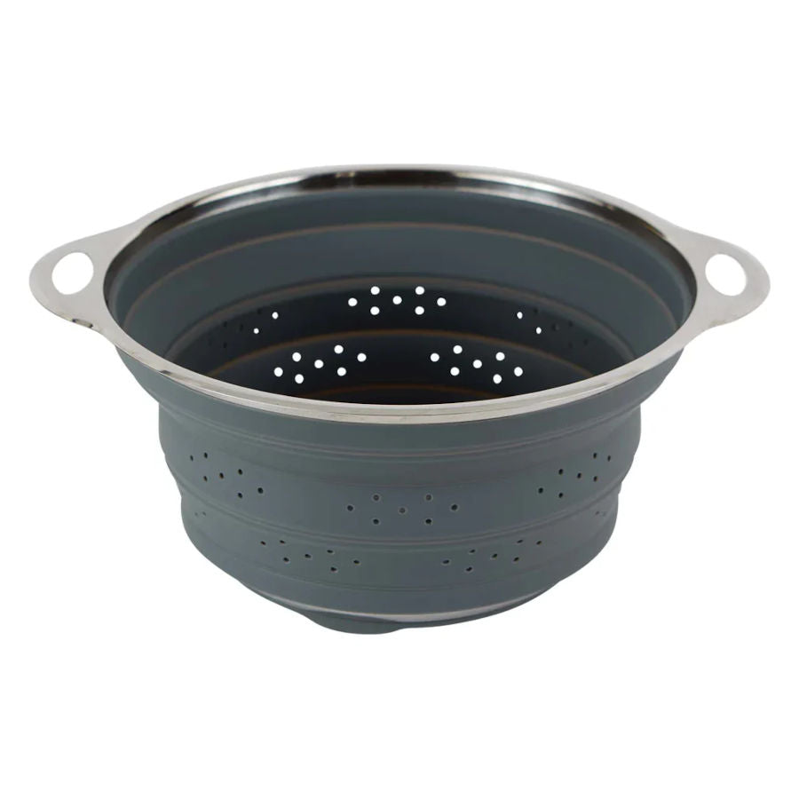 Wash fruits, veggies and even drain pasta with the Collapsible Colander. The kitchen strainer completely collapses to 1 inch tall, which is about the same thickness as two standard dinner plates. The outer rim, and bottom of the silicone colander are constructed from durable stainless steel. The collapsible colander has a 4 quart capacity, and is great for an apartment, RV or condo where space is usually limited.