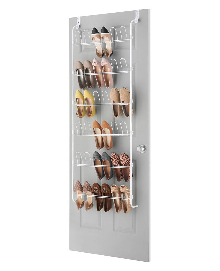 - Holds up to 18 pairs of shoes in otherwise unused space on or behind a door
