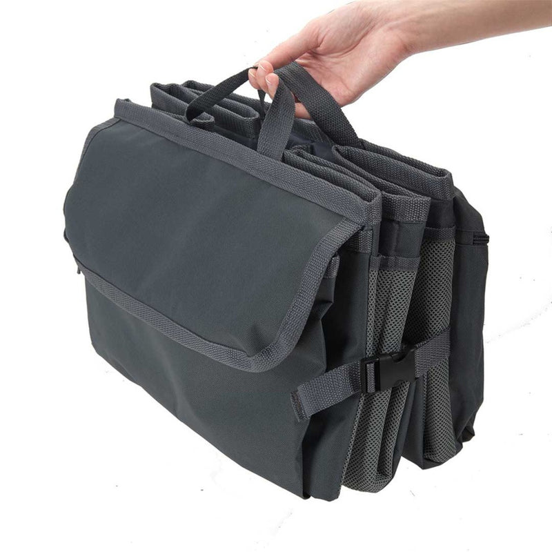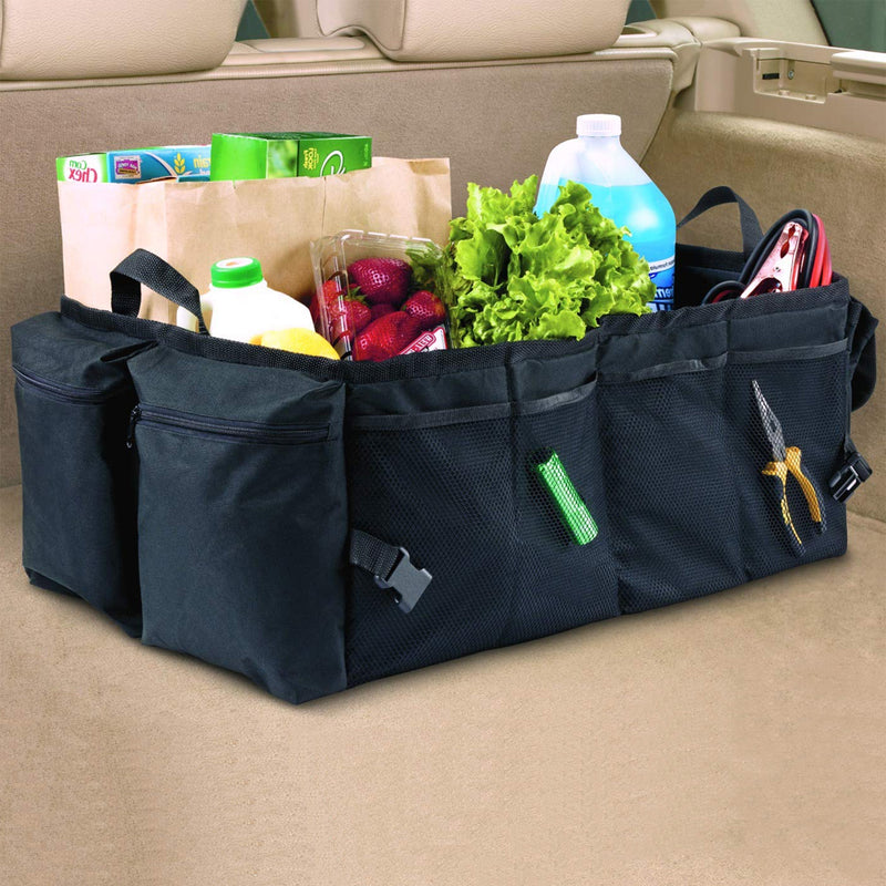 The auto storage container has four mesh pockets and two zipped end pockets where you can store smaller items so they do not get lost. The car trunk organizer is constructed from rugged pack cloth and is collapsible for convenient storage. Easily carry the organizer around with the provided side handles.