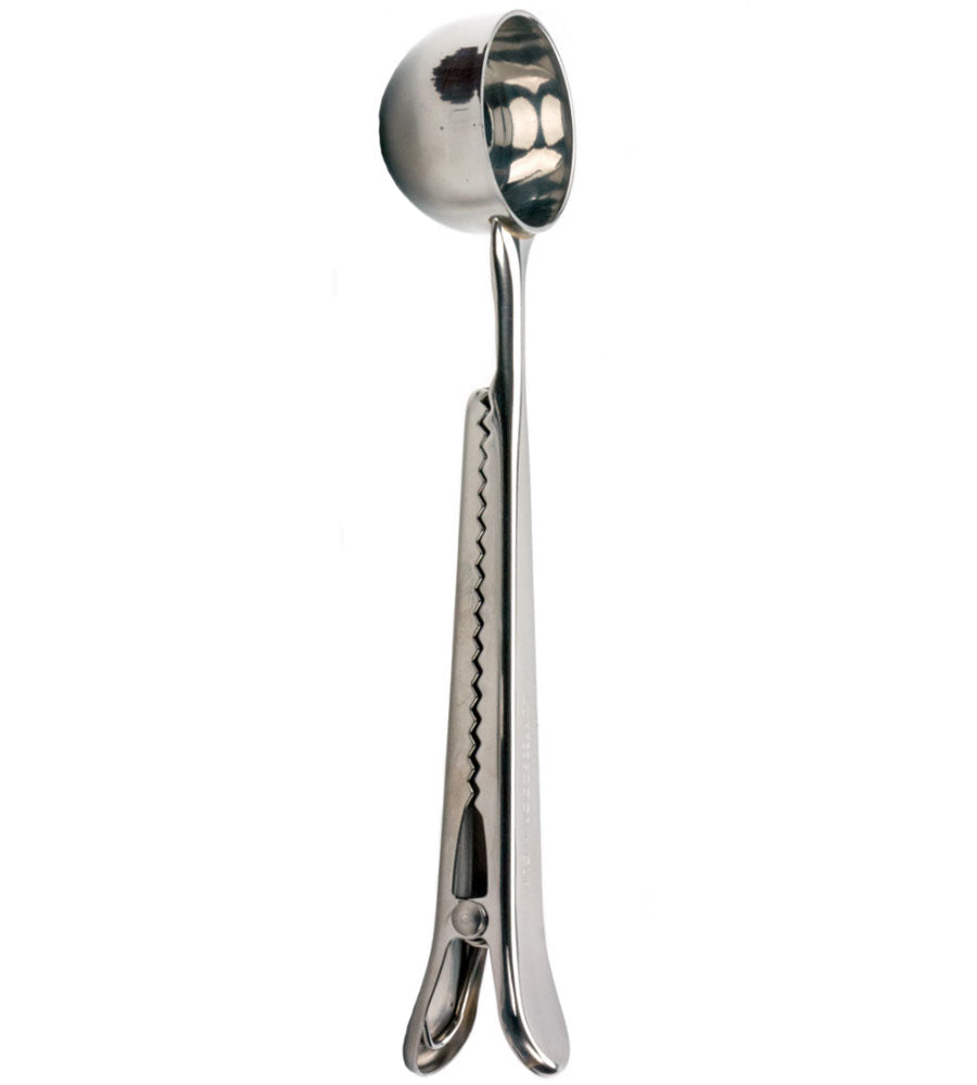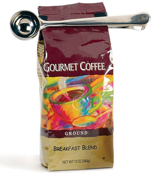 The Stainless Coffee Scoop and Bag Clip is always right where you need it. The Stainless Coffee Scoop and Bag Clip is made of solid stainless steel and is dishwasher safe for easy cleaning. The spoon end features a 1 1/2 tablespoon scoop that lets you add just the right amount of coffee to your coffee pot. The Stainless Coffee Scoop and Bag Clip is perfect for loose tea, and will deliver the tea leaves to your tea infuser. The strong clip attaches to the bag of coffee or tea, keeping it fresh. This 3 1/2 ounce coffee scoop is 7 inches in length, allowing it to reach the bottom of deep canisters.