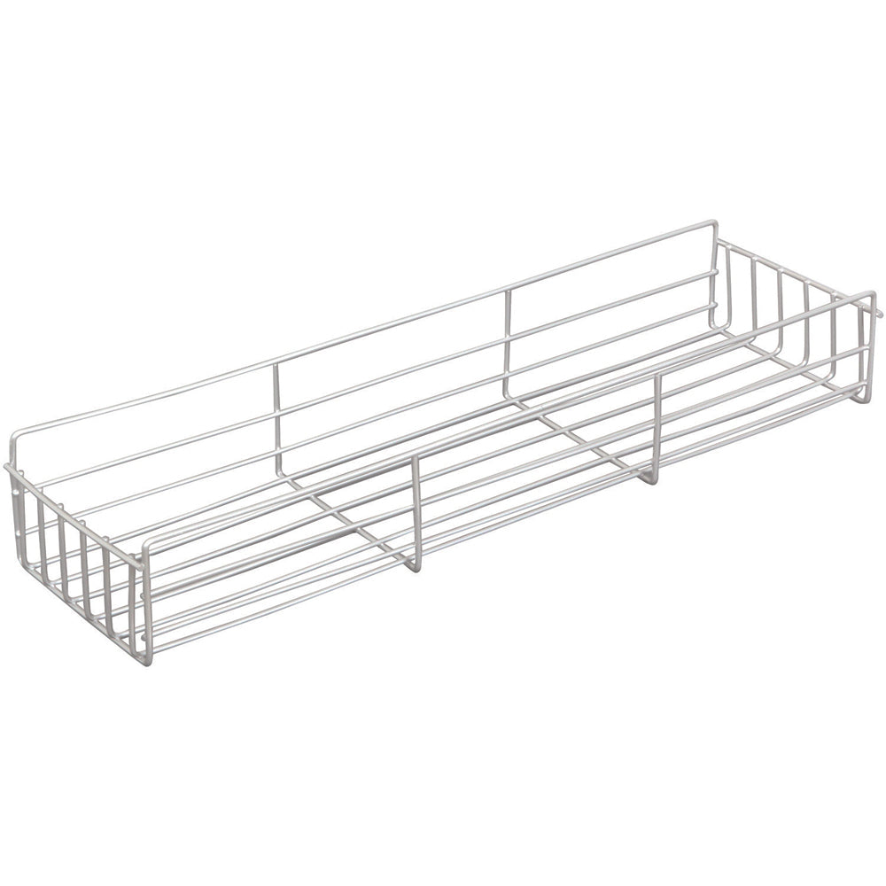 The Pantry Roll-Out Storage Basket hangs off an in-cabinet pantry roll-out storage system (each sold separately) with side hooks to provide lots of storage in your kitchen cabinets. The wire baskets are available in four different widths to offer a truly customized, versatile storage system in a kitchen cabinet or pantry. These handy pantry storage baskets are built from sturdy steel wire in a neutral white finish. The baskets simply hang from hooks on the side of the pantry units to give you space for can goods, food items or cleaning products.