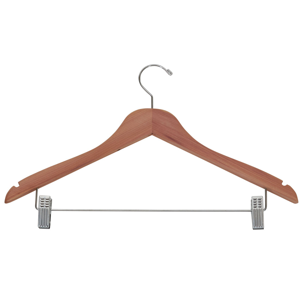 Cedar Wood Hangers are great for closets and other home storage solutions. The aromatic cedar scent will not only freshen garments, but it will also protect against moths, mildew and mustiness. Each hanger features two metal clips that slide to adjust to different garment widths, such as skirts, pants or trousers. The standard hanger part of the cedar wood hangers is great for holding shirts or jackets. The cedar hanger is constructed from natural red cedar, and can support anything from heavy winter coats to light weight shirts.