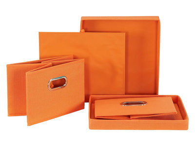 Easily keep rarely used items in your home or office safely stored and protected with the set of two Orange Collapsible Storage Boxes. These sturdy hard-sided storage boxes are constructed from durable cardboard with heavy-duty fabric covering. The collapsible design allows you to store these shelf boxes out of the way when they are not in use and the removable lids keep the contents protected and dust-free.