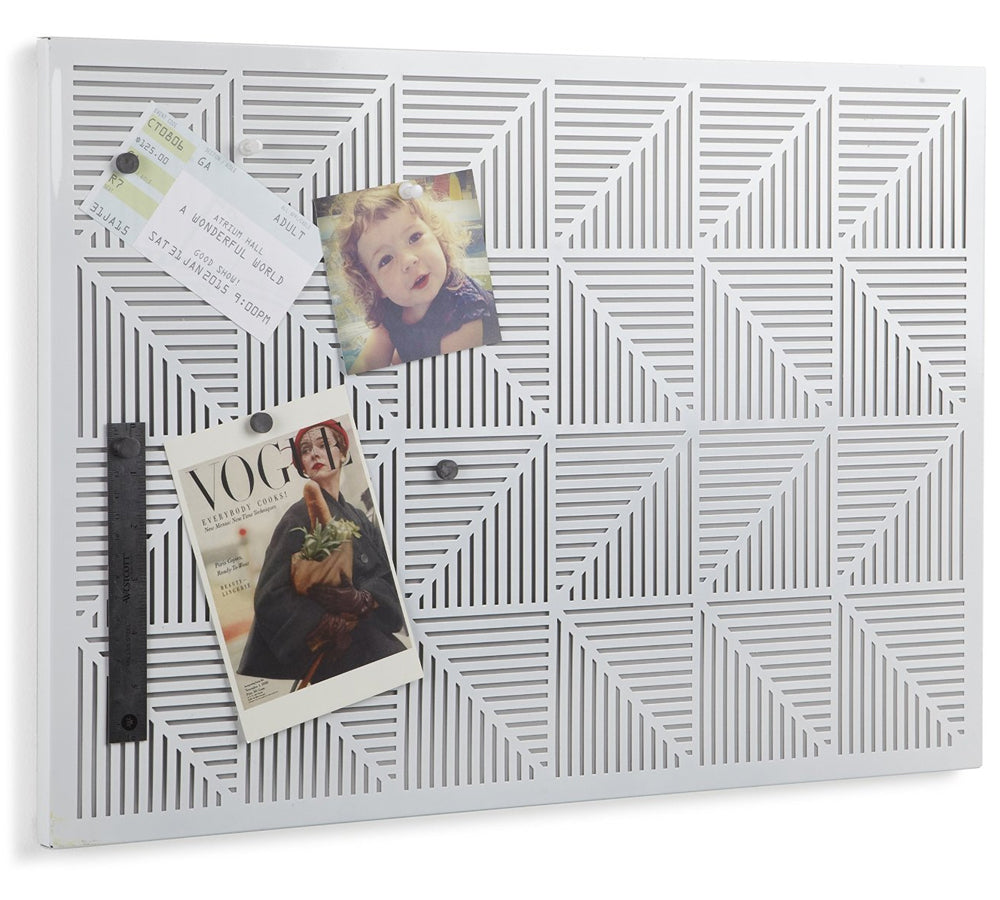 The Decorative Bulletin Board is contemporary in style and function. Includes push pins and magnets.