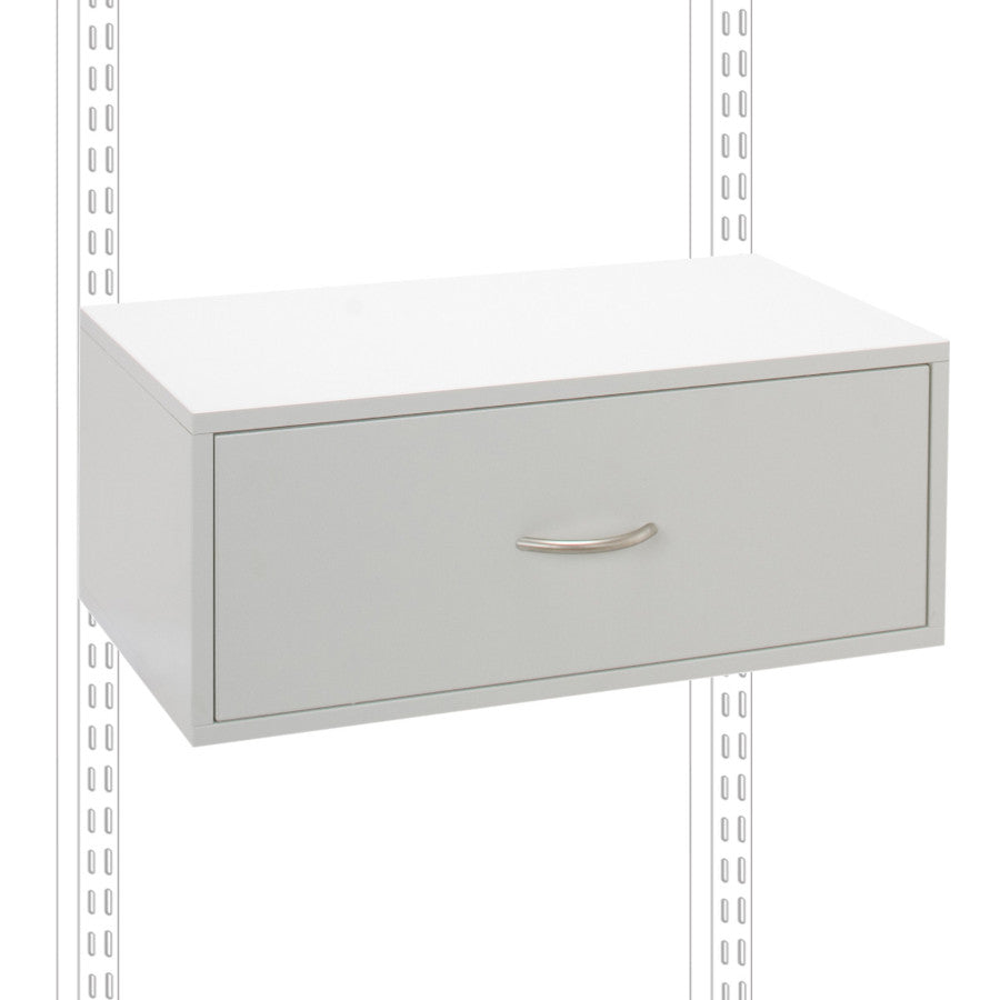 Fully utilize the wasted space in the center of your FreedomRail closet design with a White Double Hang One-Drawer O-Box. This storage drawer is a versatile closet organizer that mounts directly onto a pair of FreedomRail hanging uprights to offer convenient storage for clothing, accessories, and more.