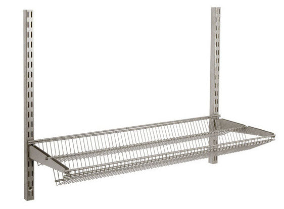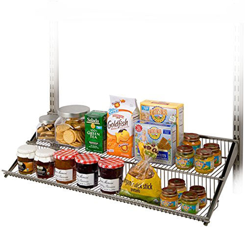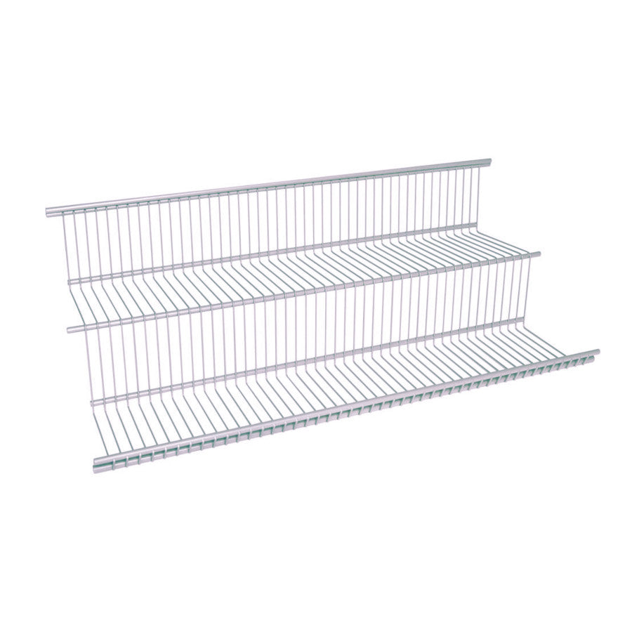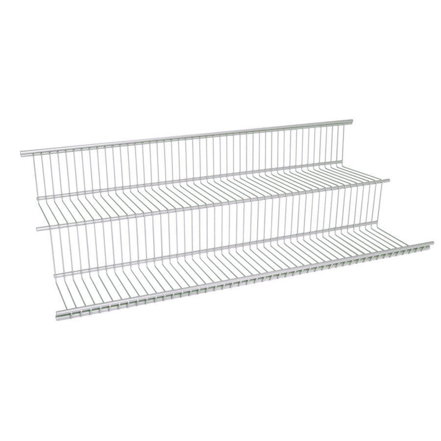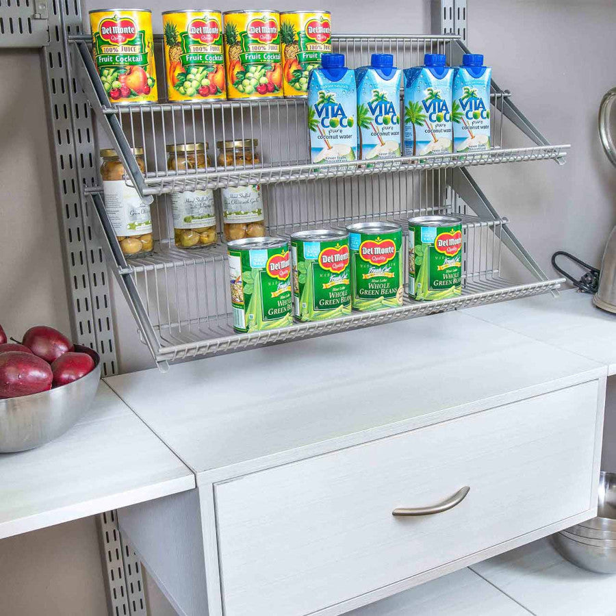 The freedomRail Nickel Two-Tier Wire Storage Shelf is terrific for adding a pair of step shelves or angled storage baskets into an adjustable freedomRail design. This wire shelf can be installed using either angled or straight freedomRail wire shelf brackets, and is made with heavy gauge steel wire with a nickel epoxy finish.
