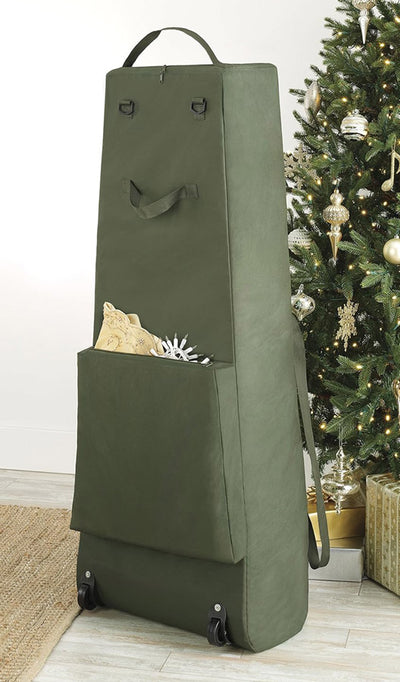 This Upright Rolling Christmas Tree Bag is made from heavy duty 600 Denier polyester and can store an artificial Christmas tree up to 9 feet tall. Make your tree easy to pack away after the holidays and easy to transport with this handy tree bag. Two casters and multiple handles make it easy to roll. The bag features a pocket to store accessories. Relieve the stress involved in setting up, packing away and storing your Christmas tree this year with our rolling tree bag.